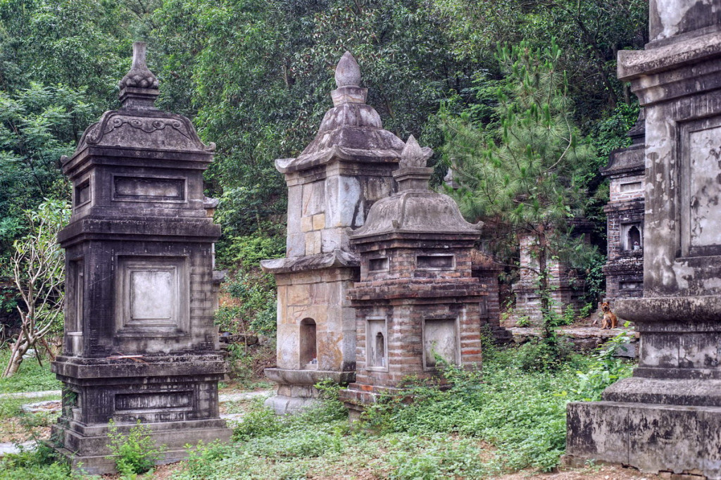 Hiện nay trong vườn chùa nằm chen vào đá có ẩn hiện nhấp nhô 35 ngọn tháp lớn nhỏ, cái được dựng bằng đá, cái được xây bằng gạch. Mỗi tháp giữ xá lị của những hòa thượng đã đắc đạo.